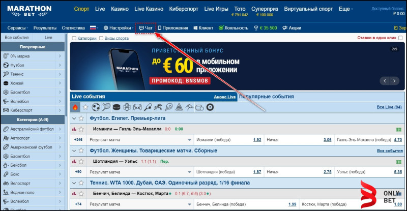 Возможность обращения в LIVE-чат представлена на сайте БК, в адаптивном ресурсе и программах «Marathon Bet». Вопросы, связанные с пополнением игрового счета и выводом денег, неправильным расчетом ставок и индивидуальным ограничениям можно разрешить только после входа в Личный кабинет БК.