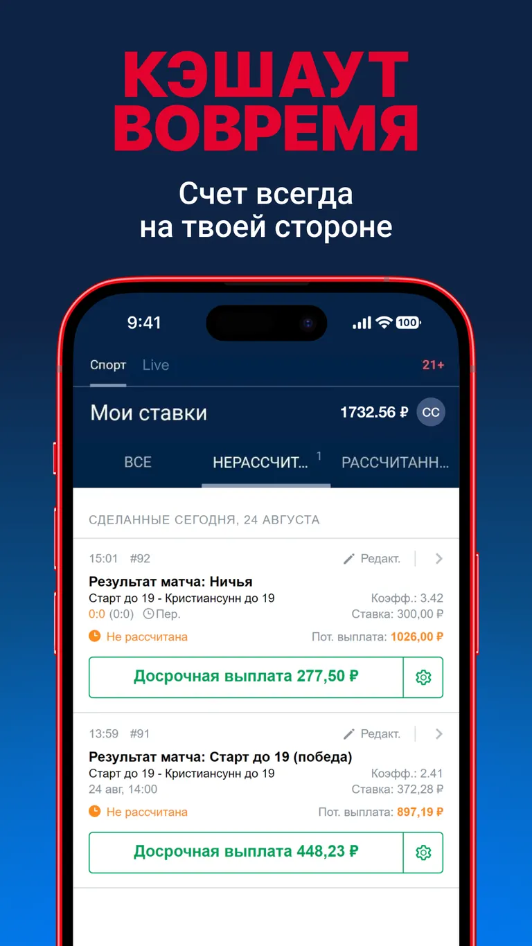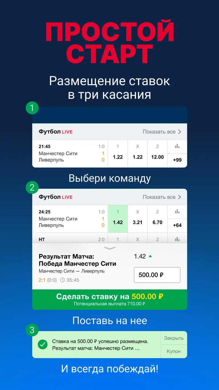 - Совершение всех доступных видов ставок на прематчи и лайвы.